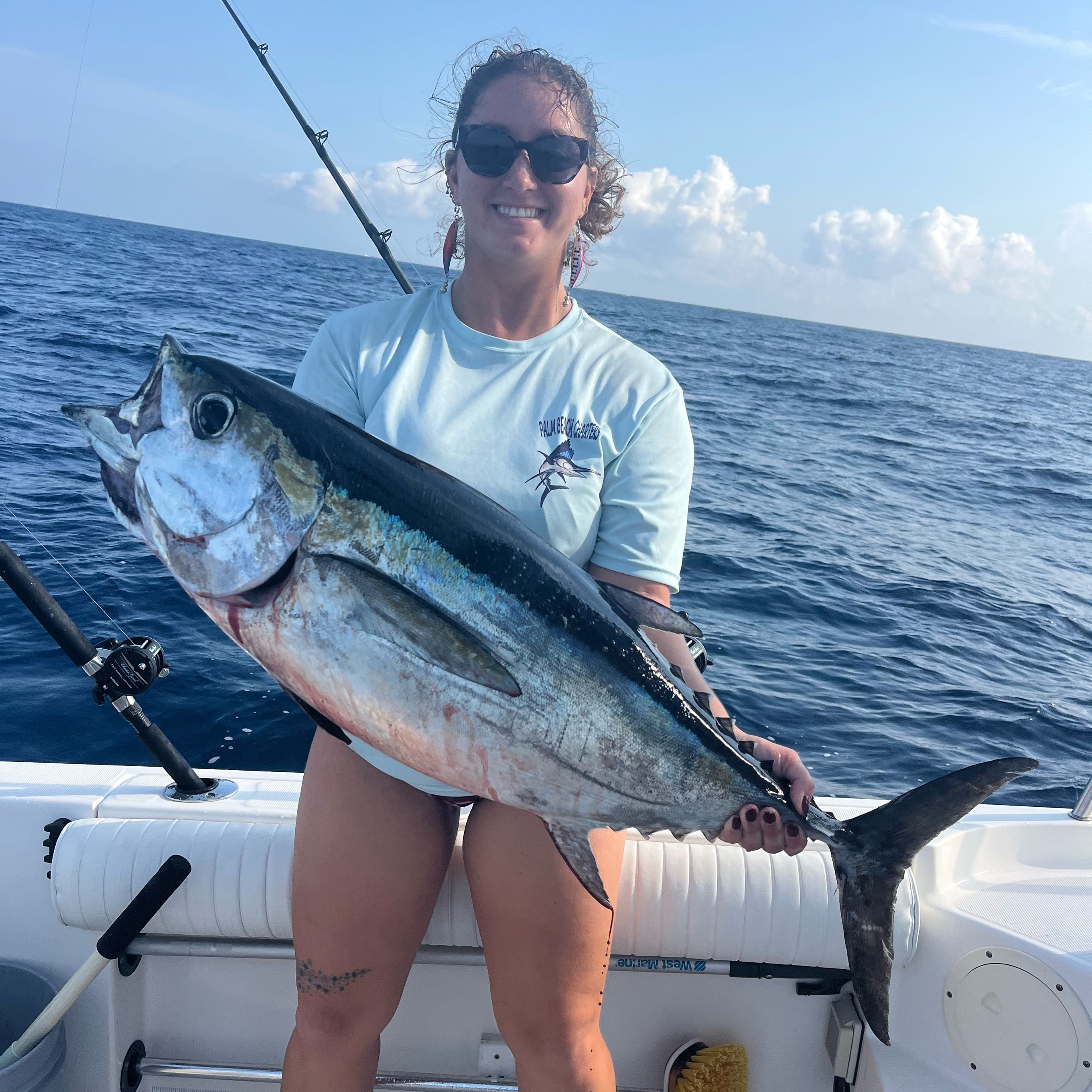Blackfin tuna are speed demons that pack a punch for their size. These little rockets usually run 15-30 pounds but can hit 40+. You'll find them in open water from the surface down to about 800 feet. They're most active off West Palm Beach in fall, winter, and spring. Anglers love blackfin for their blistering runs and high-quality meat that's perfect for sashimi. To catch them, try trolling small lures or live bait around bait schools. When you spot birds working, get ready for action. Blackfin hit hard and fight all the way to the boat. Local tip: at night, try chunking with cut bait and a light stick near your hook – the glow attracts baitfish which bring in the tuna.